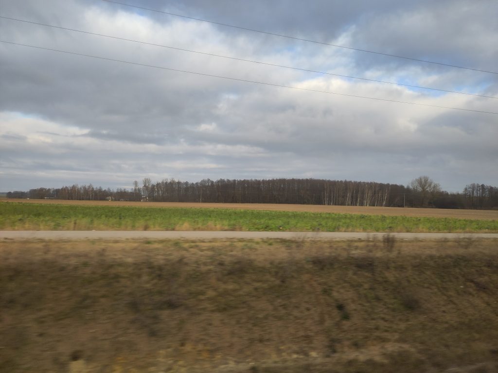 Binnenin de Poolse IC 142 is het rustig en ruim. USB-A opladers onder de stoelen en grote uitklaptafeltjes staan werken toe. Met 150 km/h en later 100 km/h ga je noordwaarts tot in Mockava.